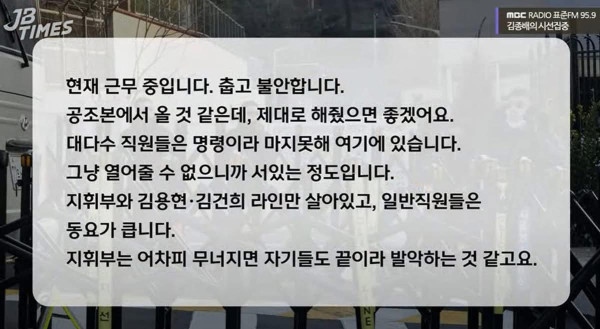 “현재 근무 중입니다. 춥고, 불안합니다. 공조본에서 올 것 같은데, 제대로 해줬으면 좋겠습니다. 대다수 직원들은 명령이라 마지못해 여기에 있습니다. 그냥 열어줄 수 없으니까 서있는 정도입니다.