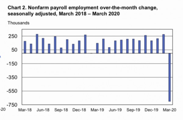 미연방 노동부 통계에 의하면 4월 4일 첫 주말까지 실업수당을 신청 한 사람은 약 6백 6십만명에 달했다. 3월 한달간 701,000 신규 실업자 등록이 보고됐다.