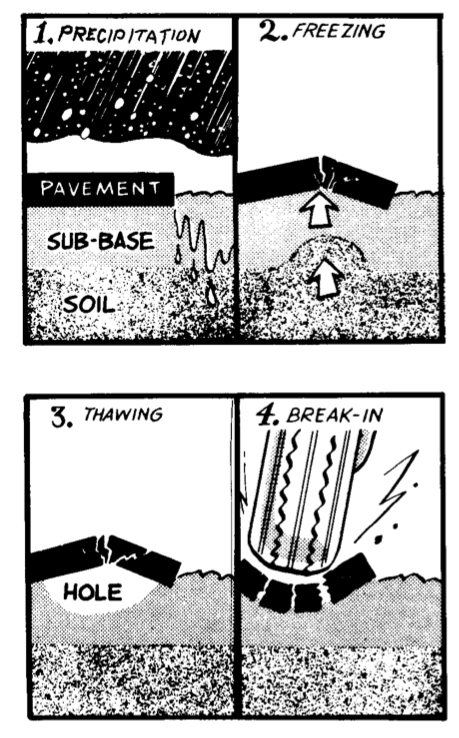 Factors leading to pothole failure by fatigue in areas subject to freezing and thawing are: 1. Precipitation adds moisture to supporting soil structure. 2. Frost heaving can damage pavement. 3. Thawing can weaken soil structure. 4. Traffic can break the pavement.