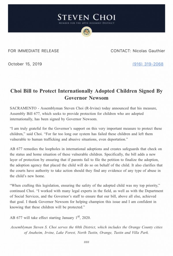최 의원은 2018년 부터 최소한 캘리포니아로 입양되는 입양아 만큼은 이러한 불행한 일을 당하지 않도록 해외에서 오는 입양아의 자동-법적신분-보장을 얻기위한 법안을 제출하고 작년에 AB724가 상,하 의회의 통과를 이미 얻은적이 있으나 제리 브라운 주 지사의 서명을 얻지 못해 무산 된 적이 있었다. 그러나 최의원은 포기 하지 않고 2019년 다시 같은법을 상정해서 또 한 번 까다로운 법사위원회와 상,하 의회의 통과를 거쳐 금년 새 주 지사의 서명을 고대 하던 참에 드디어 그 서명을 얻어 정식 법제화 가 되었다.