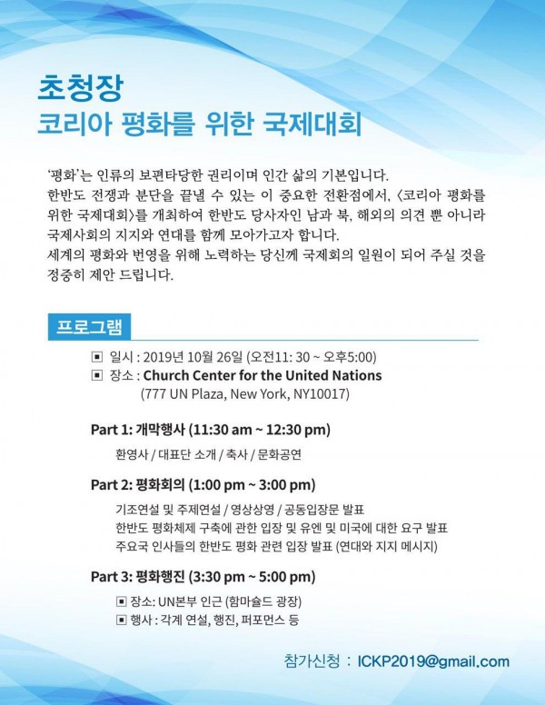 -10월 26일 UN 처치센터에서 <코리아 평화를 위한 국제회의> 개최 예정