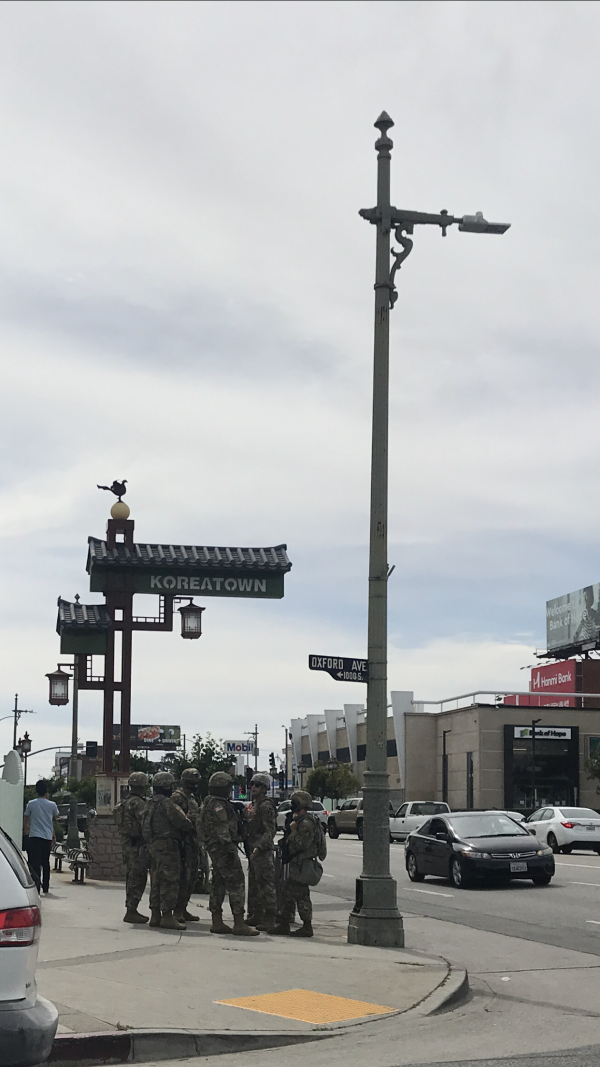 한편 LA코리아타운 중심부 웨스턴 길가와 올림픽 대로 선상 한인들이 자주 찾는 비지니스 상가등에는 가주 주방위군이 배치됐다.