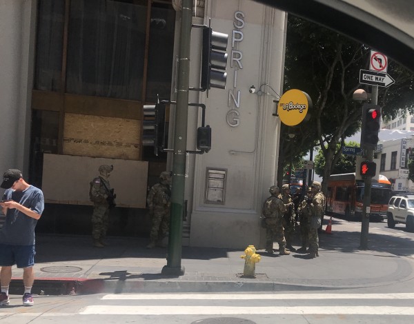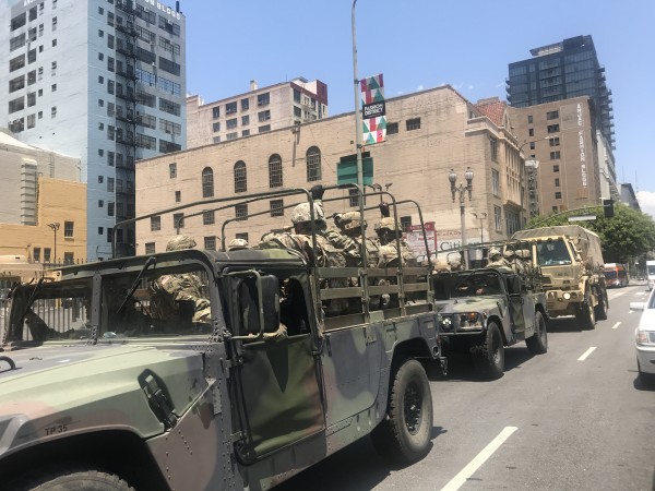 LA 다운타운 시청앞 주변 인근에는 캘리포니아주 방위군 수백여명이 장갑차와 수송차량, 험비 차량 등 수십여대에서 내려 도심 빌딩 곳곳에 배치 됐다.