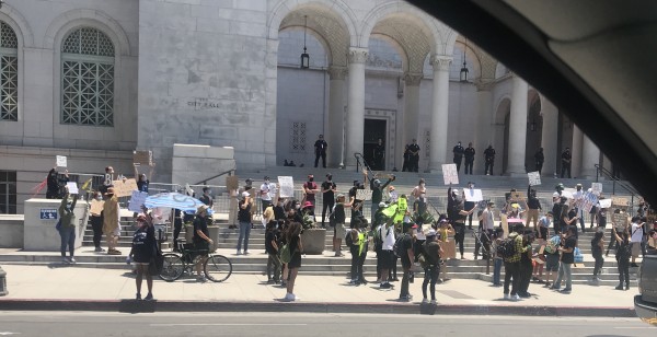백인 경찰관들에 의한 고질적인 인종차별 행위에 분노하는 항의시위가 미국 전역으로 계속 1주일째 들불처럼 번지고 있는가운데 어제 6월3일, 로스앤젤레스 시청앞 인근에 집결한 약 500여명의 시위군중들은 푯말을 들고 “Black Lives Matter”, “Justice for George Floyd”를 끊임없이 소리쳤다.
