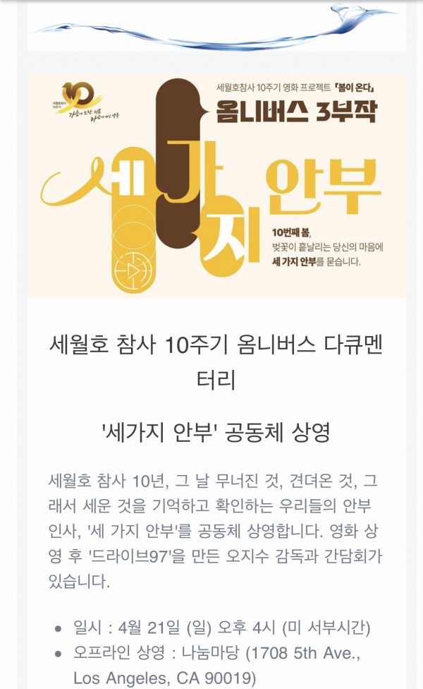 * 오프라인 상영 : 나눔마당 (1708 5th Ave., Los Angeles, CA 90019)