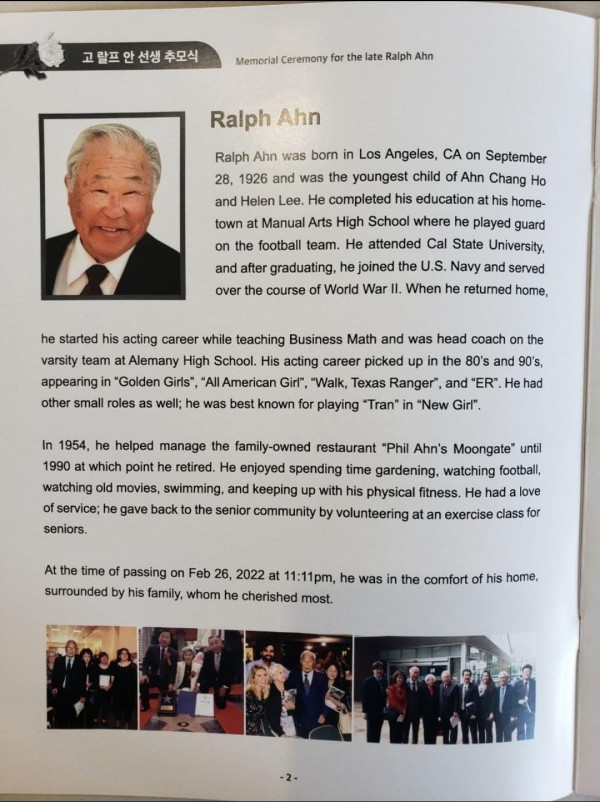 랄프 안 선생은 1926년 LA에서 도산 안창호 선생의 3남으로 태어났고, 형 안필립 선생의 영향을 받아 배우로 활동했다. 고인은 안창호 선생 기념사업과 대한인국민회 활동에도 매진했다. LA한인회는 유가족 및 한인단체들과 협의해 함께 장례를 치렀다.