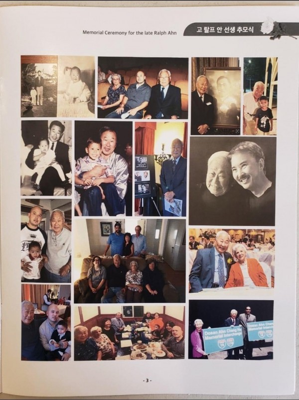 도산 안창호 선생님의 마지막 직계가족인 고 랠프 안의 추모식은 한인사회에 큰 의미를 남겨주었다. 아버지 도산 안창호 선생님이 독립운동으로 옥고를 겪으며 사망하였기에 한번도 보지 못한 랠프 안 선생님은 그에 대한 안타까움이 있음에도 아버님의 정신을 이어받아 한인사회와 가까히 활동하며 그 정신을 심어주었고 그의 따뜻한 성품은 더 아쉬운 그리움으로 남겨주었다.