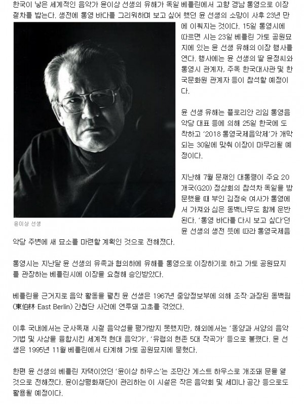 (사진: 서울신문 기사 발췌 2018.02.19 “윤이상 선생 유해 25일 고향 통영 품에”)