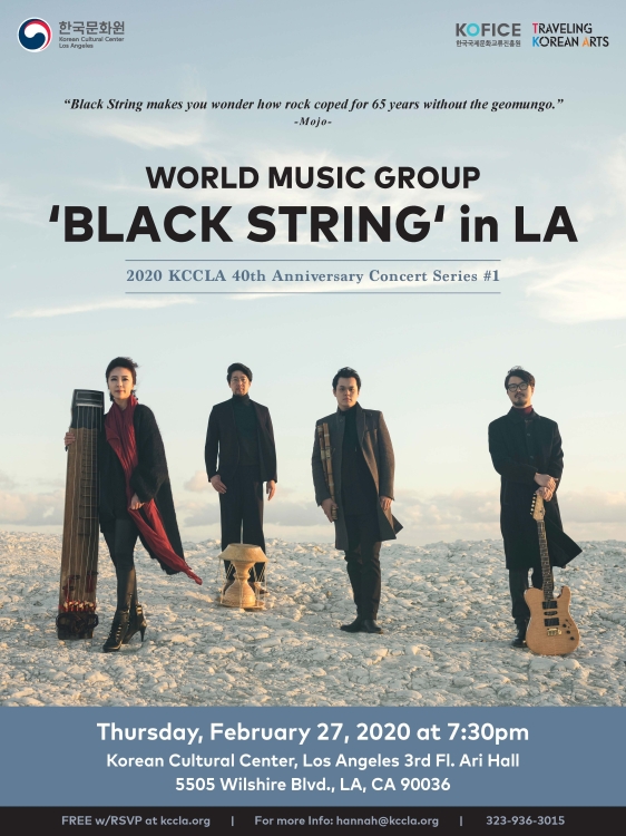 LA한국문화원(원장 박위진)은 LA한국문화원 개원 40주년을 맞이하여 특별 공연 시리즈 프로그램을 마련하였다. 이번 공연은 한국국제문화교류진흥원과 함께 2월27일(목) 저녁 7시 30분 문화원 3층 아리홀에서 ‘블랙스트링’ LA 콘서트 공연을 개최한다.