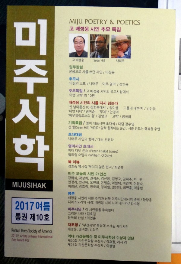 배정웅 시인은 미주한국문단의 원로로 지난해 7월 76세의 나이로 별세했다. 미주시학 발행인 미셸 정씨는 "미주 문단에서 시 전문지로서의 자부심을 갖고 미주 시인들을 주목하며 시의 지평을 열기 위해 전심을 다했던 배 선생님께 이번 호를 바친다"며 "그동안 작품으로 참여해 주신 문인이나 후원해 주신 여러분께 감사 드린다"고 전했다