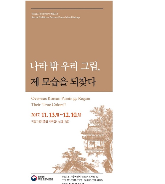 문화재청(청장 김종진)은 「국외문화재 소장기관 활용 지원 사업」으로 미국 호놀룰루 미술관(관장 션 오해로우, Sean O'Harrow) 소장 한국 회화 3점을 국내에서 보존 처리하여 오는 13일부터 12월 10일까지 국립고궁박물관에서 일반에 공개한다.