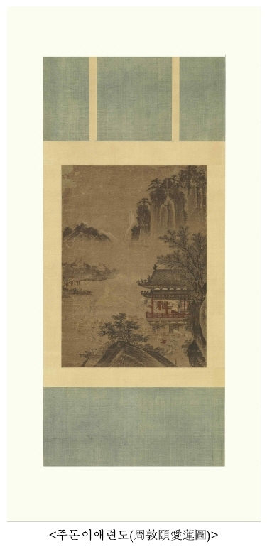 17세기에 제작된 <주돈이애련도>는 중국 북송대 성리학자 주돈이(1017~1073)가 연꽃을 감상하는 모습을 그린 그림이다. 주돈이는 주희에게 성리학을 열었다는 평을 받는 인물로 「애련설(愛蓮說)」이라는 글에서 연꽃을 군자의 꽃으로 칭송하였는데, 이 그림에서 주돈이가 연꽃을 감상하는 모습은 선비의 고고한 감상 취미를 보여주는 내용으로 조선 초기부터 종종 그려진 소재다. 호놀룰루 미술관이 소장한 <주돈이애련도>는 처음에 국적을 오해하여 일본식으로 장황되어 보관되다가, 이번 사업을 통해 조선 시대 전통 장황으로 복원되었다.