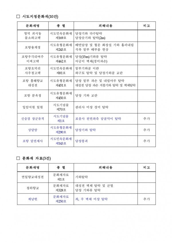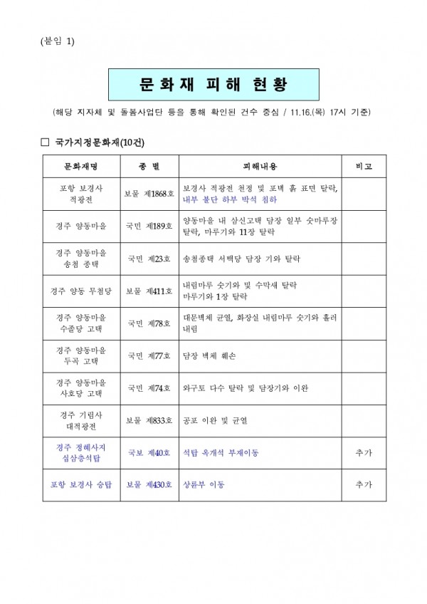 문화재청(청장 김종진)은 11월 15일 발생한 포항시 지진과 관련하여 포항시와 그 일대의 문화재 피해상황에 대한 점검을 실시한 결과, 16일 현재 23건의 문화재(국가지정 10건, 시도지정 및 문화재자료 13건)에 피해가 발생한 것으로 잠정 집계됐다고 보도자료를 통해 상황을 설명했다.