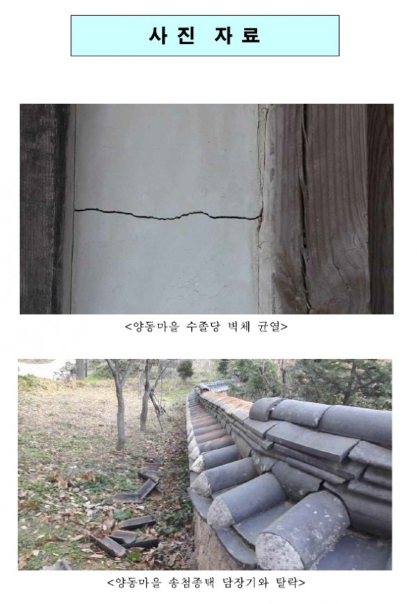 문화재 피해 유형은 대체로 담장과 건물 기와 탈락, 벽체 균열 등 경미한 피해가 대부분이며, 세부적으로는 기와탈락 12건, 벽체 일부 균열 8건, 석탑 옥개석 부재 이동 등이 3건이다.