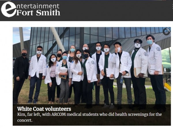 맨 왼쪽 검정 양복 차림이 알칸사스 보건의과 대학의 김 브라이안 총장이고 콘서트 당일 관객들의 건강 진단을 도운 의과대 학생들과 기념촬영