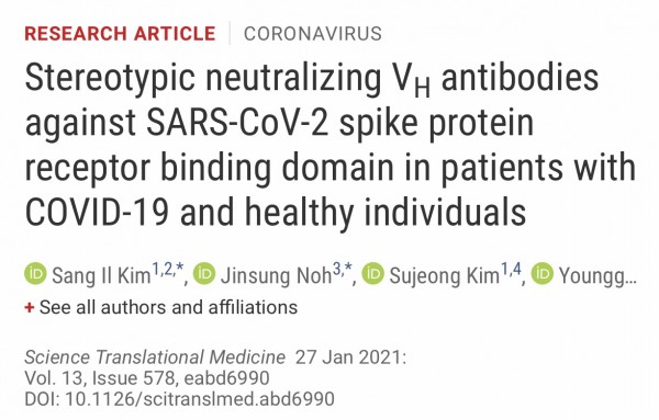 신종 코로나바이러스 감염증에 감염되지 않은 정상인 역시 대다수 코로나19 환자가 공유하고 있는 바이러스 무력화 항체를 생성하는 면역세포를 이미 갖고 있다는 매우 놀라운 연구 결과가 최근 1월 27일자 출판된 ‘사이언스 트렌스레이션 메드신’(Science Translational Medicine 27 Jan 2021)을 통해 나왔다.