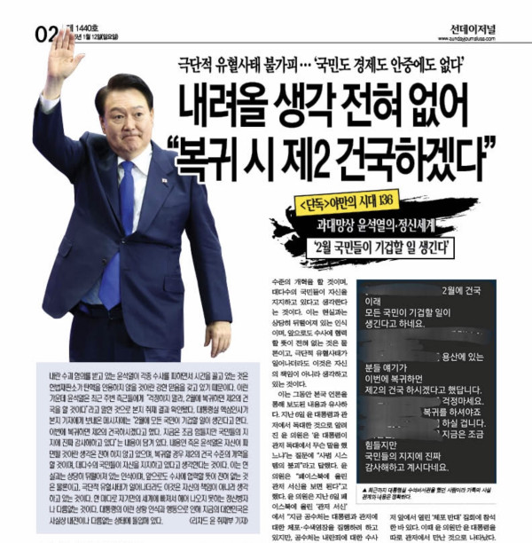 대통령실 핵심인사: 2월에 건국 이래 모든 국민이 기겁할 일이 생긴다고 하네요. 이번에 복귀하면 제2의 건국하시겠다고 했습니다. 그러니 걱정 안 해도 됩니다.