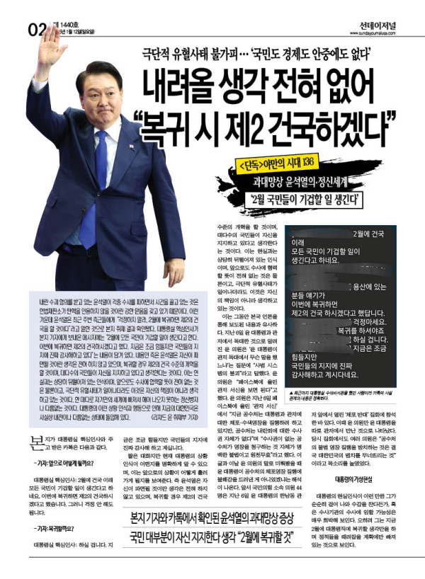 내란 수괴 혐의를 받고 있는 윤석열이 각종 수사를 피하면서 시간을 끌고 있는 것은 헌법재판소가 탄핵을 인용하지 않을 것이란 강한 믿음을 갖고 있기 때문이다. 이런 가운데 윤석열은 최근 주변 측근들에게 “걱정하지 말라, 2월에 복귀하면 제2의 건국을 할 것이다”라고 말한 것으로 본지 취재 결과 확인됐다. 대통령실 핵심인사가 본지 기자에게 보내온 메시지에는 “2월에 모든 국민이 기겁할 일이 생긴다고 한다. 이번에 복귀하면 제2의 건국하시겠다고 했다. 지금은 조금 힘들지만 국민들의 지지에 진짜 감사해하고 있다”는 내용이 담겨 있다.