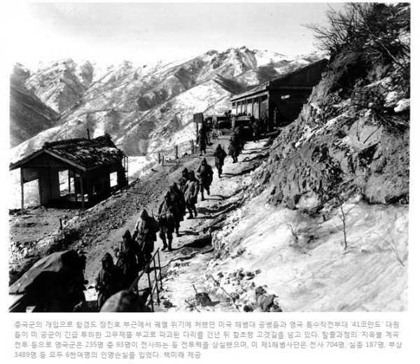But across the rugged border, in a shock counter-offensive, China stormed south. In a desperate action, 27th Brigade fought its way out of the trap, to join the UN Command on a harrowing, 200-mile ‘ bug out.” And across the peninsula, surrounded by eight enemy divisions in terrain higher than Cassino and temperatures colder than Stalingrad, 41 Commando fought alongside US Marines at Chosin Reservoir – ‘ Hellfire Valley’ , the most nightmarish battle fought by American or British troops in living memory - and escaped annihilation by a hair’ s breadth.