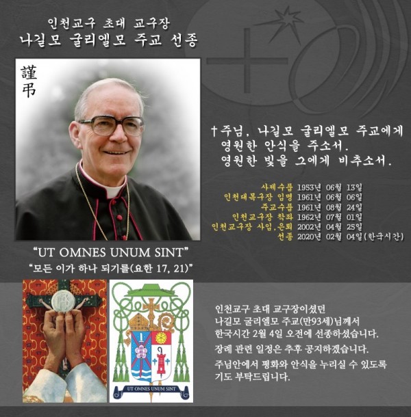 천주교 인천교구의 부고에 따르면 “인천교구 초대 교구장이셨던 나길모 굴리엘모 주교님께서 2020년 2월 4일(화) 오전 8시 50분(미국시간 2월 3일 오후 6시 50분) 하느님의 품으로 선종하셨습니다. 고인의 천상영복을 위해 많은 기도바랍니다.”