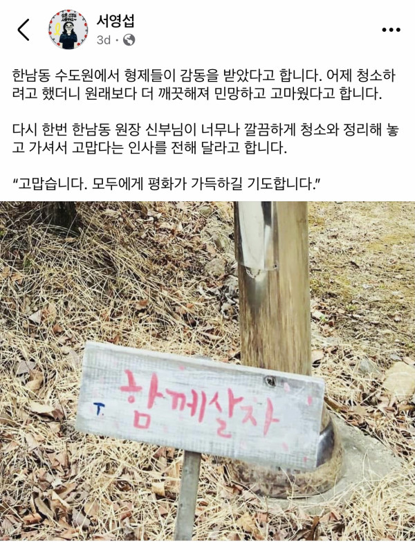 한남동 수도원에서 형제들이 감동을 받았다고 합니다. 어제 청소하려고 했더니 원래보다 더 깨끗해져 민망하고 고마웠다고 합니다.