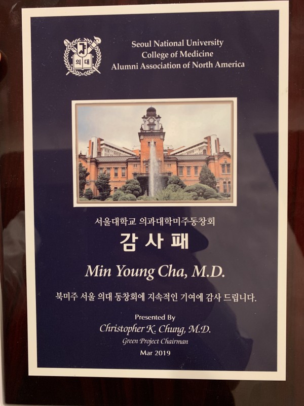 서울메디칼그룹 (SMG) 차민영 회장(차민영내과원장)은 지난 23일 LA 동부 인더스트리 소재 퍼시픽팜 리조트에서 열린 ‘2019 서울대 의과대학 북미주 동창회’ 에서 미주한인사회 의료발전과 서울대 의대 동창회에 기여한 공로로 감사패를 받았다. 차민영 회장은 1982년 서울대 의대를 졸업했다.