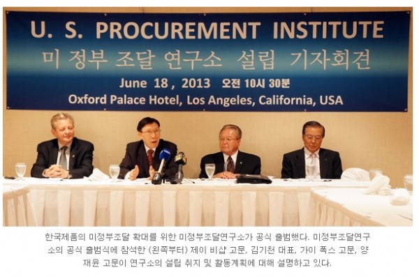 미 정부 조달시장 사업을 체계적으로, 효과적으로 추진하기 위해서, 2013년 6월18일 로스앤젤레스 한인 타운 Oxford Palace Hotel에서 <미 정부 조달연구소(U.S. Procurement Institute)>를 출범시킨바 있다. 조달시장에 관심있는 연구원을 비롯, 20여명의 전문가들로 구성된 순수한 민간기구로서 정부나 기관의 도움없이 사비로 운영되는 연구소가 설립된 것이다.