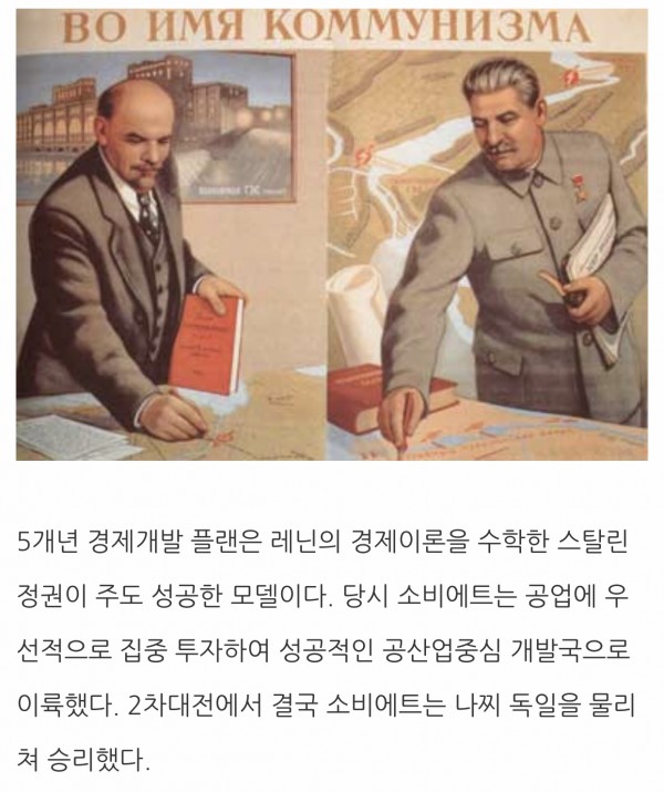 5개년 경제개발 플랜은 레닌의 경제이론을 수학한 스탈린 정권이 주도 성공한 모델이다. 당시 소비에트는 공업에 우선적으로 집중 투자하여 성공적인 공산업중심 개발국으로 이륙했다. 2차대전에서 결국 소비에트는 나찌 독일을 물리쳐 승리했다.