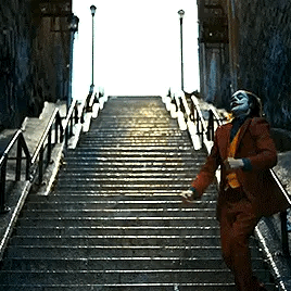 (조커가 뉴욕 빈민가 브롱스의 긴 계단을 내려오면서 광인춤을 춘다)