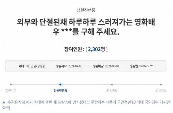 한편, "청원 내용에는 윤 씨의 사정이 자세히 담겨있어 과연 그 청원인이 누구일까에도 관심을 모으고있다"고 UPI뉴스 통신은 비중있게 보도했다.