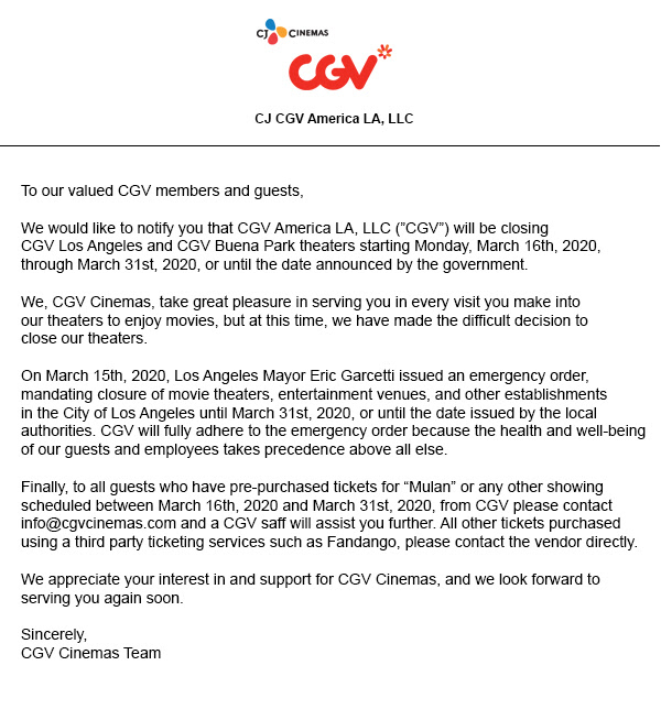 By now, you may have heard that the Los Angeles mayor has closed down the theaters from March 16 through 31, 2020. We are going to be temporary closed during that period at CGV - Los Angeles until further notice.
