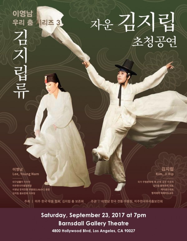 가을의 문턱에 들어서는 이번주 토요일 23일 7시 (P.M), 미국 로스앤젤레스 헐리웃가에 위치한 ‘반스돌 갤러리 띠어터’ (Barnsdall Gallery Theatre - 4800 Hollywood Blvd. LA, CA. 90027)에서 국가무형문화재 27호 승무 이수자 자운 김지립 초청공연을 갖는다. 김지립 선생은 전통춤 "한량무"의 관념적으로 화석화된 형식의 틀을 훌쩍 뛰어넘어 색다른 춤의 세계를 만들어 명성이 높다. 한국 전통무용에 관한 제반 문의가 많을것으로 예상되어 공연 이후 25일 부터 29일까지 연수회 형식으로 각 LA와 OC의 무용소에서 별도 세미나도 준비했다. LA한국문화원에서는 28일 (목) 오후1시부터 5시까지 관심있는 분들을 위해 “자운 김지립류 살풀이춤 연수회” 워크샵도 진행한다. 유정신보는 18일 LA한인타운에서 자운 김지립 선생과 ‘미주한국무용협회’ 이영남 회장과 한국에서 온 ‘김지립춤보전회’ 각 지부장들을 만나 이번 초정공연의 취지를 들어보았다.