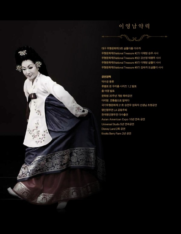 When she performed the “Masterpieces by Masters” dance concert 6 years ago. Lee has devoted her life to learning all the dances considered masterpieces of Korean Traditional Dance.