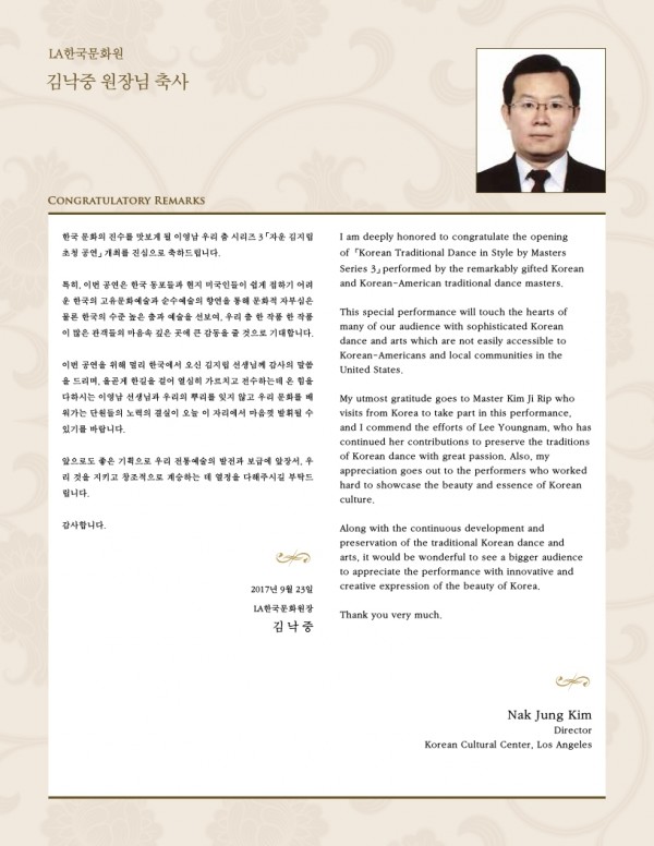 My utmost gratitude goes to Master Kim Ji Rip who visits from Korea to take part in this performance, and I commend the efforts of Lee Youngnam, who has continued her contributions to preserve the traditions of Korean dance with great passion. Also, my appreciation goes out to the performers who worked hard to showcase the beauty and essence of Korean culture.