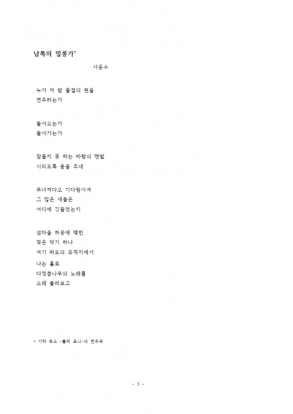 그 중에 ‘남쪽의 밀롱가’라는 곡이 있었는데 특히 그 연주가 좋아서 제가 즉흥시를 썼습니다. 다행히 연주가님도 시가 무척 마음에 든다며 다음 음반을 낼 때 표지에 싣겠다고 하셨습니다. ‘남쪽의 밀롱가’는 아르헨티나 탱고 작곡가 피아졸라를 추모하는 뜻으로 만든 곡이며 ‘밀롱가’는 탱고를 즐기기 위한 사람들이 모이는 장소나 시간을 의미한다고 합니다.