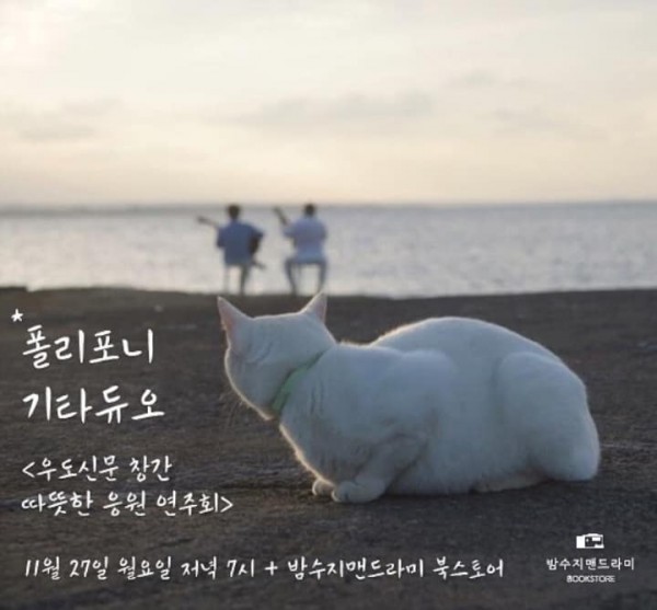 저는 2016년, 제주도 우도에 있는 ‘우도창작스튜디오’ 입주 작가로 선정되어 본가인 대구와 우도를 오가며 문학 창작을 하고 있습니다. 작년에 입주 작가 단체 전시회 때 부산의 남성 기타 듀엣 <폴리 포니>가 축하 공연을 해주셨는데 이번에 또 우도에 오셔서 우도에 처음 생긴 책방 오픈과 우도 신문 창간 축하 연주를 해 주셨습니다.