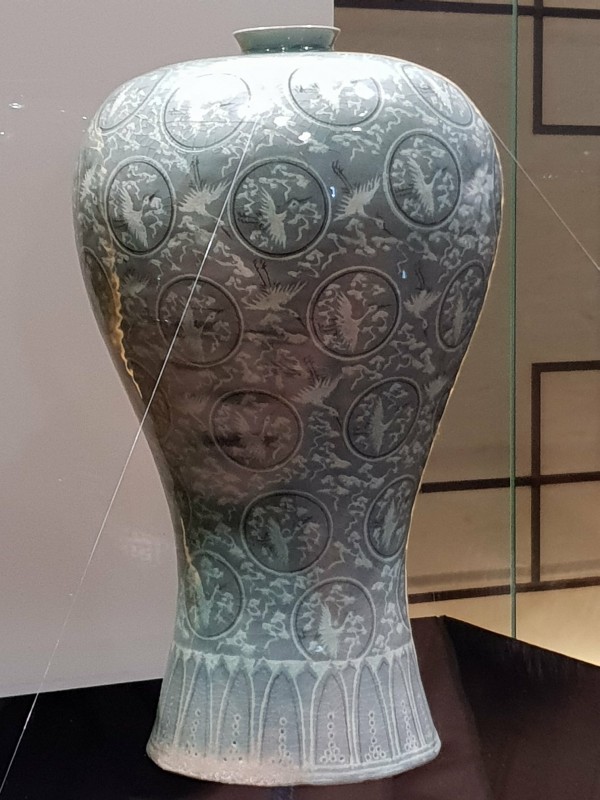 감명, 감명이었다. 〚청자상감운학문매병], 고려청자 중에서도 최고로 치는 명품이다. 초벌 자기를 상감한 뒤, 초벌로 굽고, 다시 고열의 불로 구워낸 명품 雲鶴紋 매병에서 실제로 학들이 일제히 날아오르거나, 내려앉고 있는 것 처럼 보였다. 흙을 빚어 말린 다음 유약을 칠한 뒤 구워내니, 저런 翡色의 원융한 푸르름이 펼쳐지고, 그 푸르름 속으로 상감으로 그려진 학들이 푸드기며 날아오르는 것 같았다. . . 全鎣弼 (1906~1962)은 당시 경성의 기와집 20채 값에 해당하는 거금 2만원을 주고 이 작품을 구입했다고 한다. 전형필 컬렉션의 수많은 작품들은 이처럼 눈밝은 그의 선택으로 외국으로 팔려가지 않고 국내에 남을 수 있었다.