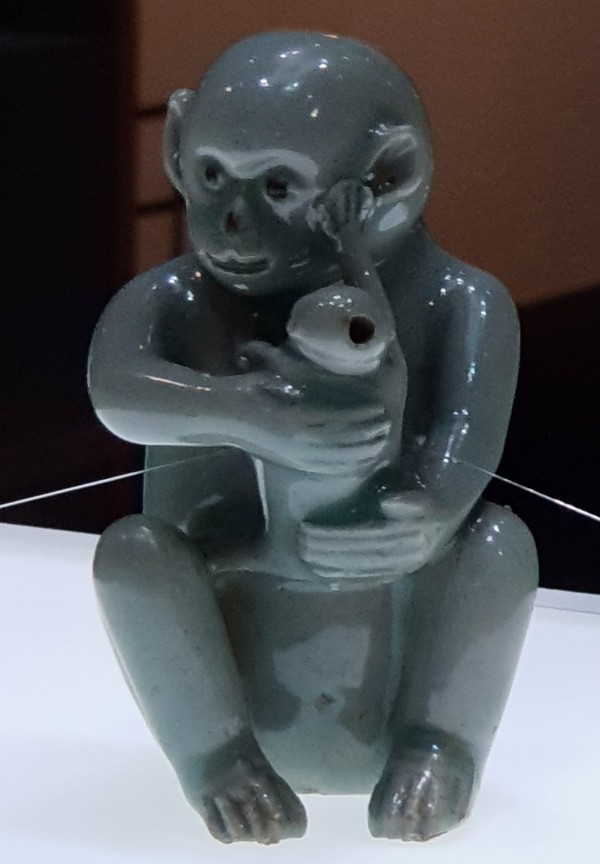〚청자모자원숭이형 연적〛은 높이 10cm정도에 불과한 조그만 청자 연적. 연적은 벼루에 먹물 갈때 필요한 물 그릇.이 조그만 청자연적 앞에 관람객들이 모여 서 있었다. 어미 원숭이가 새끼 원숭이를 품어 안았고, 새끼가 한쪽 손가락을 활짝 펼친 손으로 어미의 얼굴을 보듬고 있다. 새끼 원숭이의 앙증맞은 손가락, 어미원숭이의 배꼽까지. . .청자 비색으로 형상화해 낸 원숭이 母子 의 천진스럽고도 귀여운 자애로움이라니.