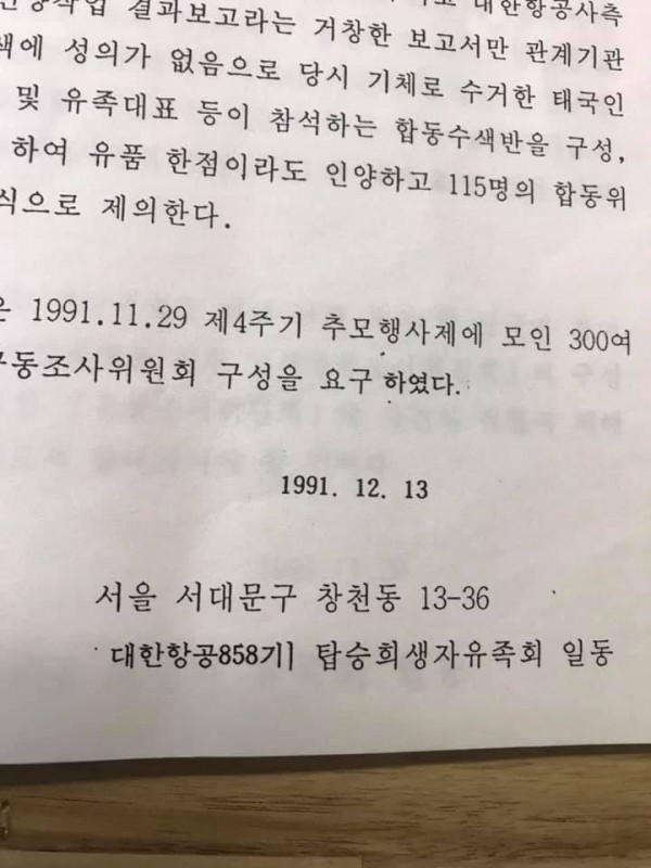 최근 실종자 가족들은 대한항공 858기 동체를 발견할 가능성이 큰 지점을 새롭게 확인하고 정부에 재수색을 요청했습니다.