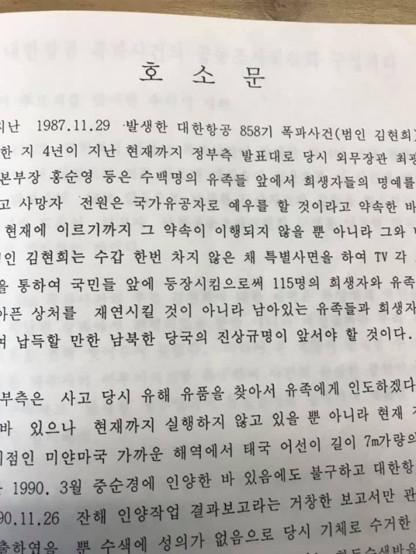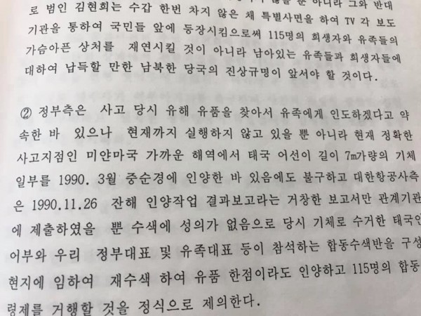 “정부는 KAL858기 탑승자 유행와 유품을 반드시 찾아서 유족들에게 돌려드리겠습니다”