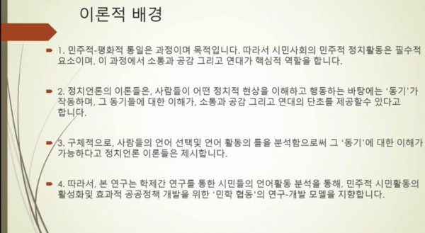 이종화 교수는 이번 연구는 학제 간 학술연구에 바탕을 둔 시민사회 공공정책 개발지원, 한반도의 민주적, 평화적 통일 및 재미동포 사회의 정치력 신장을 장기 목표로 삼고 있다고 했다.