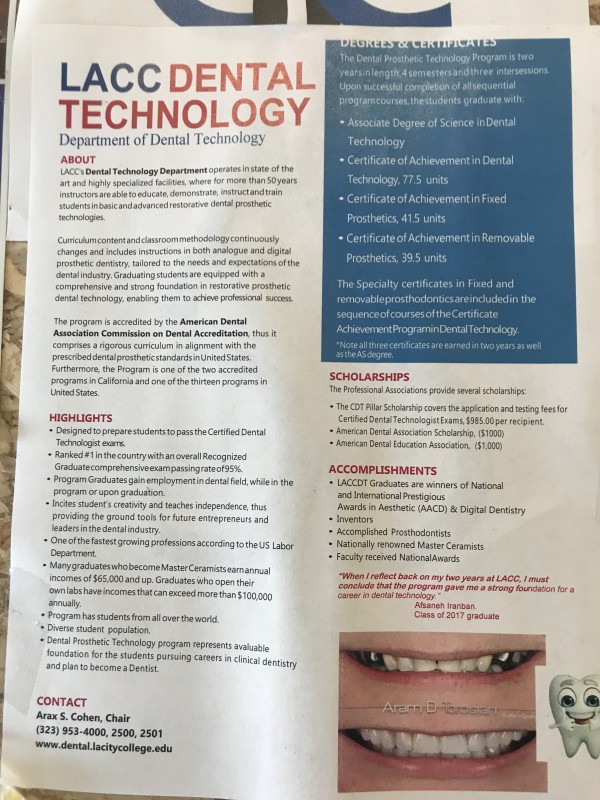 치과기공학은 시메스터 이수학점 77.5 서티피케이트 과정과 44학점짜리 2가지 과정이 있다고 한다. 치과기공학은 LACC가 전미 탑1위 라고 한다. 자격시험에서 재학중에 95%이상 합격률을 보였다. 졸업생들의 연 평균 수입은 $7만불이며, 독립해서 기공소를 운영시 평균 수입 $100,000 십만불의 고소득자로 나타났다고 밝혔다. 그외 치의학 관련 기구에서 다양한 장학금을 제공한다.