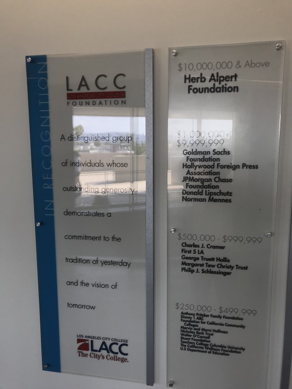 LACC는 로컬 LA시정부와 캘리포니아주의 주민들의 세금으로 설립 운영되는 교육기관이지만 미국의 대기업들과 은행권 그리고 개인 이름의 법인체등지에서도 장학금을 기증해 오고있다. 대표적으로 “허브 알퍼트 파운데이션”(Herb Alpert Foundation)은 단독 법인체로서 $10,000,000 천만불을 기부했다. 그리고 은행권인 “골드만삭스”(Goldman Sachs Foundation), 그리고 JP Morgan 등지에서 거액을 기부했다. $1만불 이상 기부한 수많은 인사들 중 동양계 (한인으로) 보이는 Hong씨 성과 Lee씨 성의 이름이 기부자 명단에 보인다.