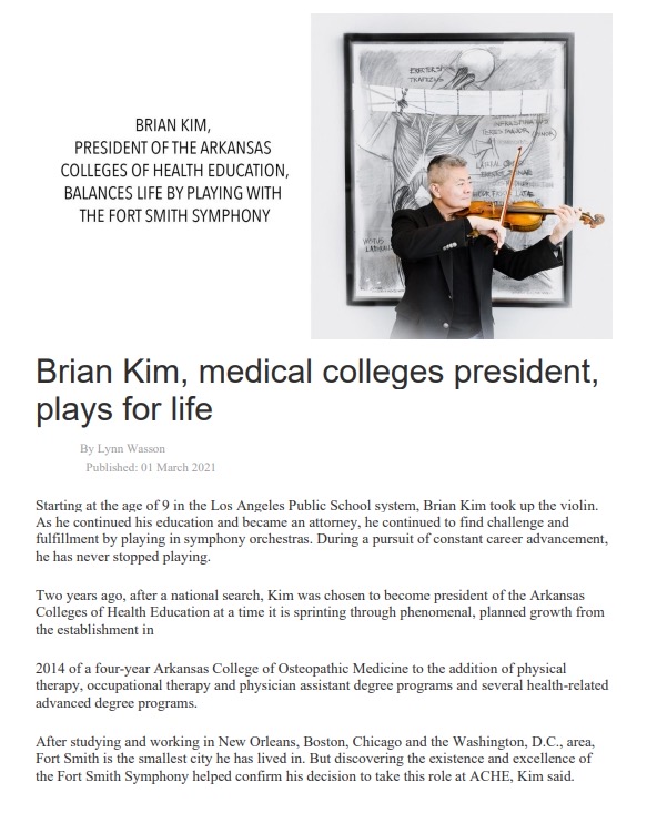 eFortSmith Magazine의 린 워슨 기자가 취재한 바이올리니스트 브라이안 김, 알칸사스 의과대학 총장의 이야기 편, 발췌 갈무리