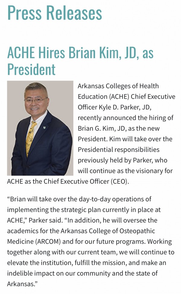김국현(BRIAN G. KIM) 알칸사스 보건교육 의과대학교(ACHE)총장