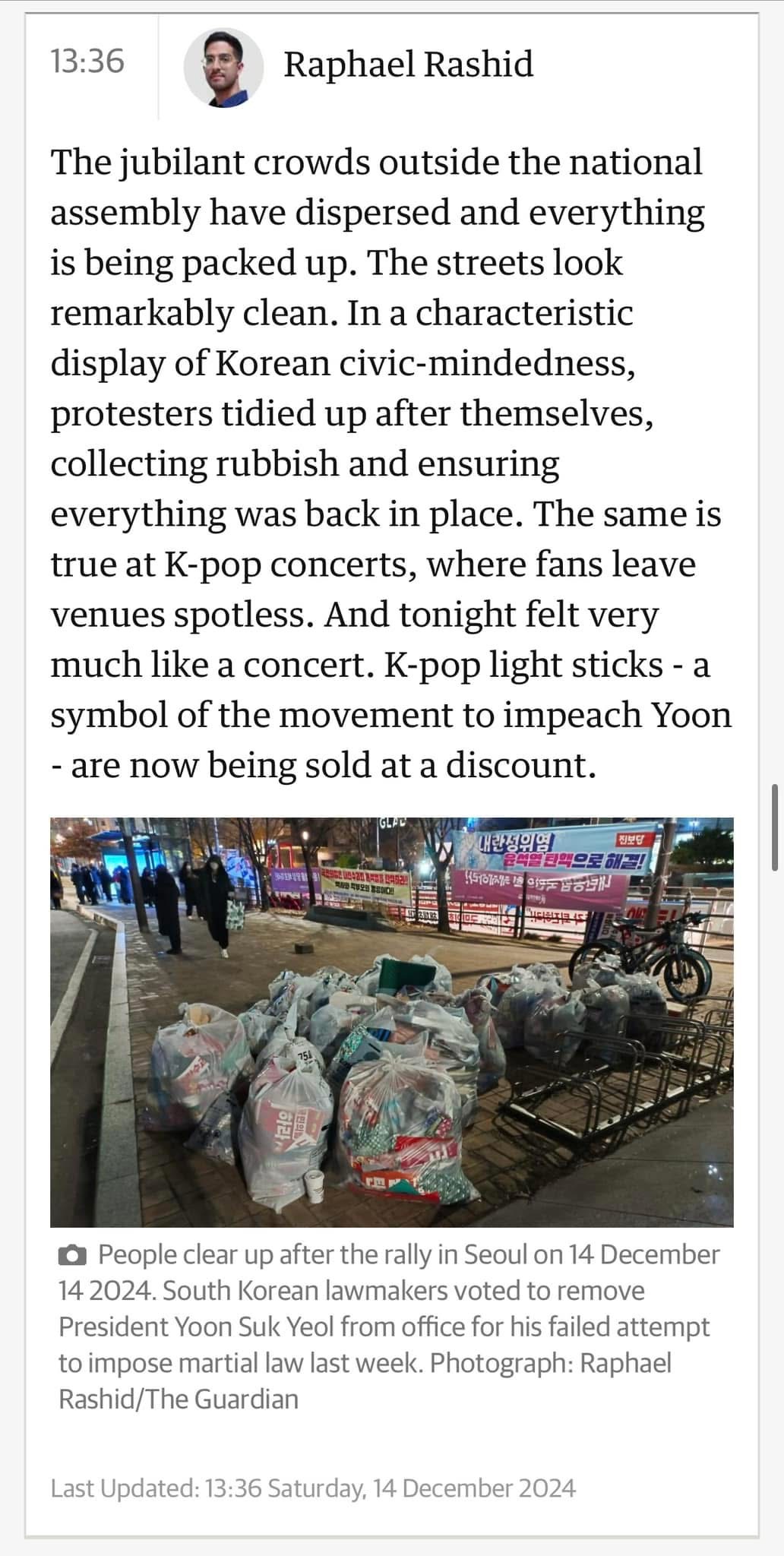 “국회 밖의 환호하던 군중은 해산했고, 모든 것이 정리되고 있습니다. 거리는 놀라울 정도로 깨끗해졌습니다. 시위대는 한국 특유의 시민의식을 보여주듯이 쓰레기를 수거하고 모든 것을 원위치 시키는 등 스스로 뒷정리를 하였습니다. 팬들이 공연장을 완벽하게 정리하고 떠나는 케이팝 콘서트에서도 마찬가지입니다. 오늘 밤은 정말 콘서트처럼 느껴졌습니다. 윤석열 탄핵 운동의 상징인 응원봉도 할인 판매되고 있습니다.”