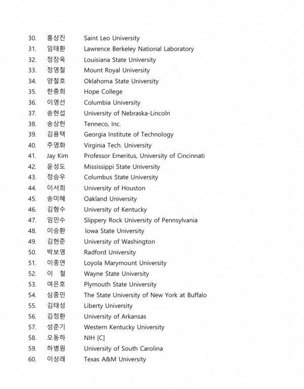 University; 김수현, University of Arizona; 김양수, Virginia Western Community College; 김준, Southern Illinois University; 신선우, Oakland University; 유영주, University of Michigan; 이윤석, University of Florida; 장혜정, Clemson University)