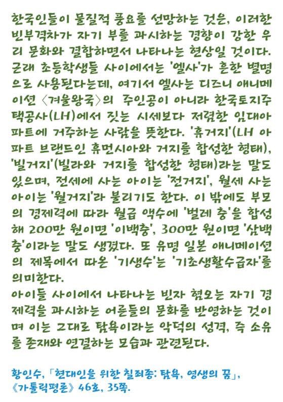 근래 초등학생들 사이에서는 '엘사'가 흔한 별명 으로 사용된다는데, 여기서 엘사는 디즈니 애니메 이션 <겨울왕국>의 주인공이 아니라 한국토지주 택공사(LH)에서 짓는 시세보다 저렴한 임대아 파트에 거주하는 사람을 뜻한다. '휴거지'(LH 아파트 브랜드인 휴먼시아와 거지를 합성한 형태), '빌거지'(빌라와 거지를 합성한 형태)라는 말도 있으며, 전세에 사는 아이는 '전거지', 월세 사는 아이는 '월거지'라 불리기도 한다. 이밖에도 부모의 경제력에 따라 월급 액수에 '벌레 충'을 합성 해 200만원이면 '이백충', 300만원이면 '삼백충'이라는 말도 생겼다. 또 유명 일본 애니메이션의 제목에서 따온 '기생수'는 '기초생활수급자'를 의미한다.
