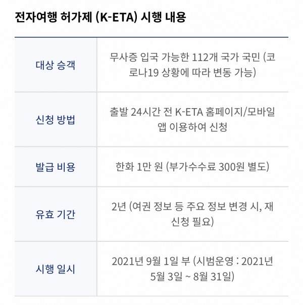 우리 부는 '21. 9. 1.부터 대한민국 전자여행허가(K-ETA)를 정식 시행한 바 있습니다. (시범운영 : '21. 5. 3.)